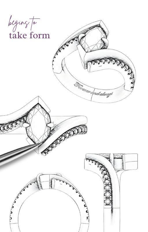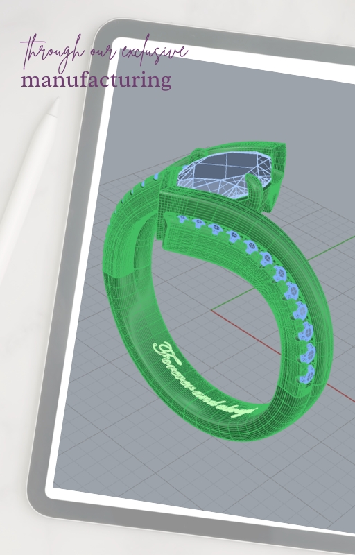 Our journey starts off with a complimentary design consultation, available either in person or online. Experience the features of our specialised 3D modelling software as it breathes life into your vision. We’re your trusted companions on this jewellery quest, guiding you through the intricate world of the four C’s and helping you choose the ideal stone and design that aligns seamlessly with your requirements and preferred price points. After this creative consultation, we provide photorealistic images of your design, ensuring that every detail meets your vision before we venture into the next exciting phase.