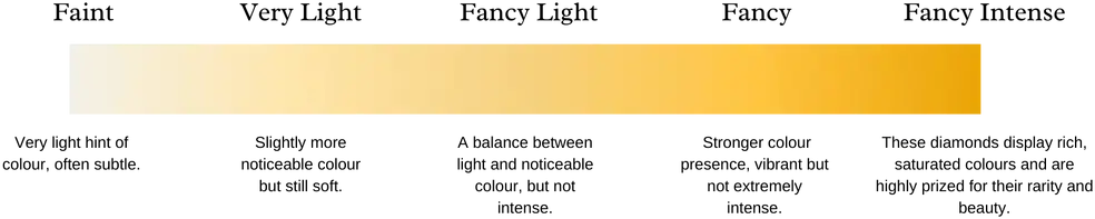 Yellow: These diamonds range from a faint yellow to a deep, vivid hue. Generally, the more intense the colour, the more valuable the diamond.