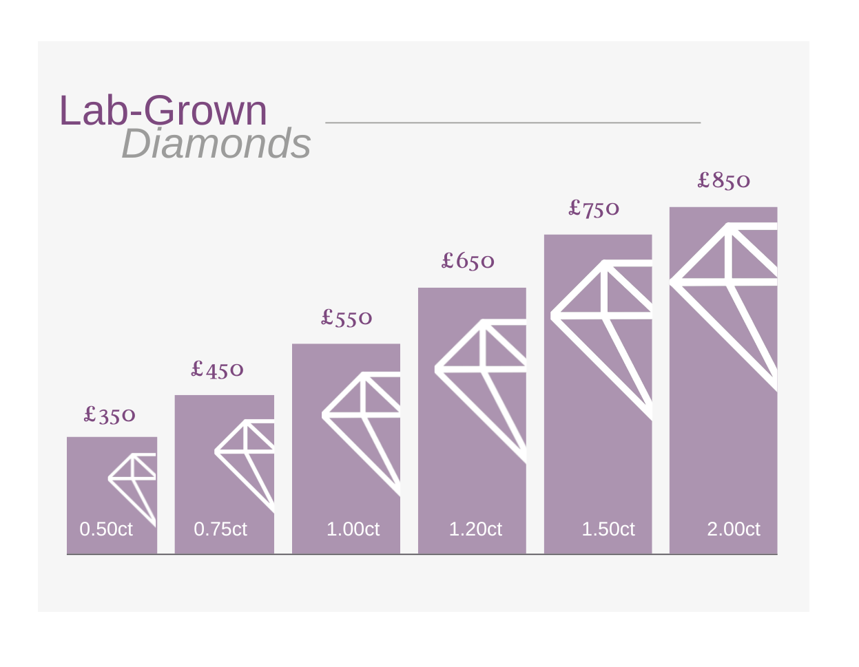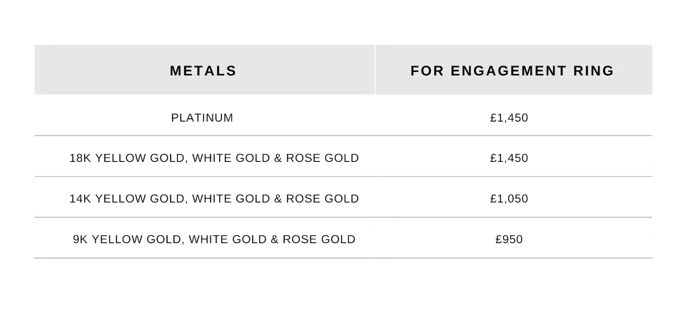 The prices listed below are for diamonds of D-F colour, eye-clean clarity (VS/SI), and excellent cut, polish, and symmetry. These factors ensure optimal brilliance and quality. While these prices serve as a guideline, we can source diamonds tailored to your specific preferences in terms of colour, clarity, cut, and budget, ensuring your bespoke piece meets your exact vision.