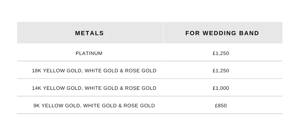 We are committed to collaborating with you to bring your vision for a bespoke piece to life. Below is an overview of our starting prices for custom engagement rings and wedding bands. The final cost will be influenced by your selected design and materials, ensuring that your piece is truly unique. Additionally, for simple Wedding bands, we can source lathe-made designs if you’re looking for a pre-designed option which is not custom-made.