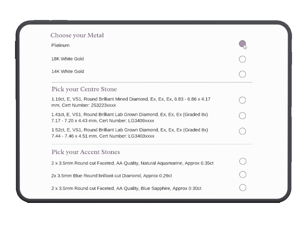 Embark on a commitment-free design session with your designer via Zoom! Whether you're near or far, share your ideas, preferences, and price points in a virtual consultation. See your vision materialise on-screen using our state-of-the-art 3D modelling software, allowing you to explore various concepts. After our initial Zoom meeting, your designer will refine the details and present conceptual renders, showcasing a range of materials and stones for you to choose from. Craft your perfect piece effortlessly and seamlessly, all from the convenience of your screen!