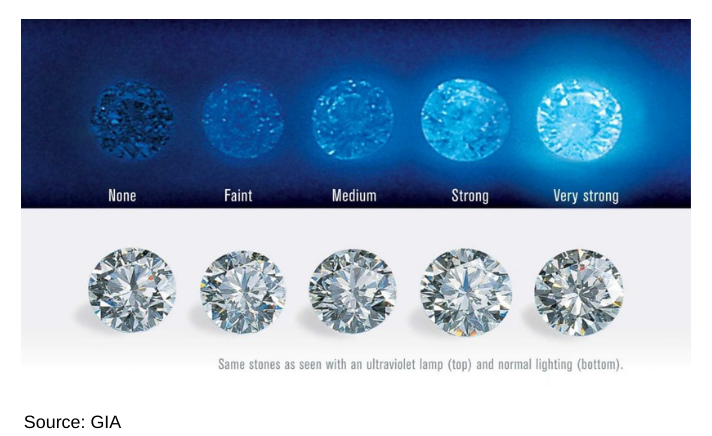 Diamond fluorescence is essentially how ultraviolet (UV) light affects a diamond. Similar to how whites appear brighter or teeth seem to glow under UV light, diamonds emit visible light when exposed to UV rays. On a Diamond Grading Report, fluorescence indicates the strength of this reaction to UV light, an essential component of daylight.