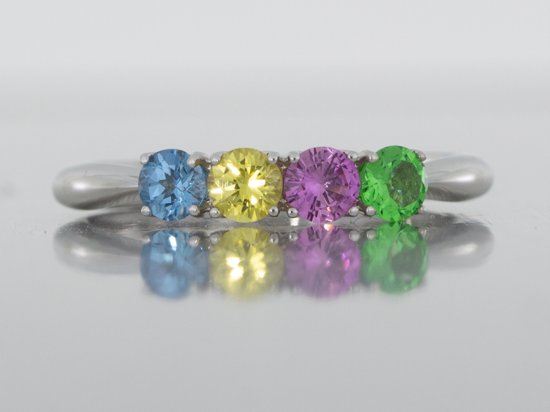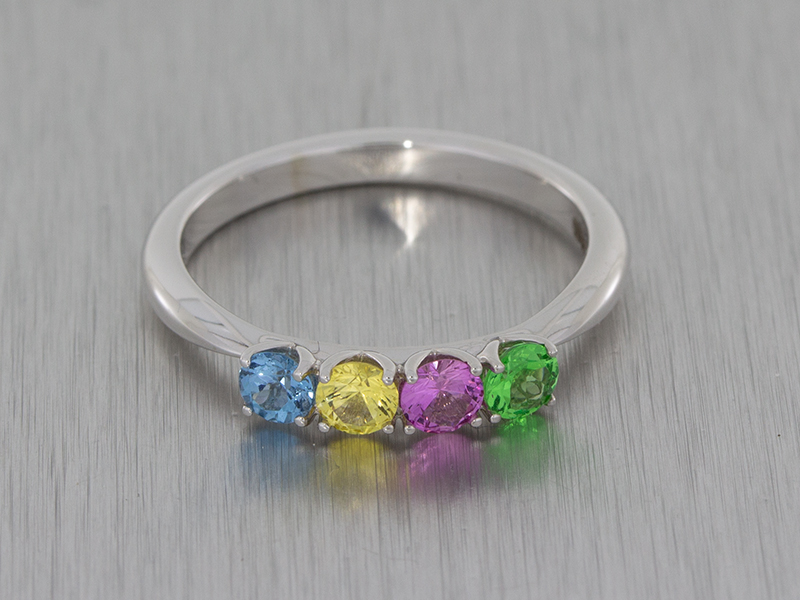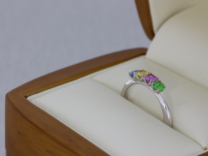 This ring really comes to life with the colourful vibrancy of the gemstones. Each stone is individually held in a floral-inspired setting.