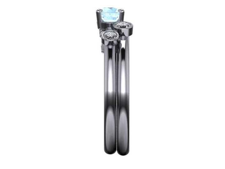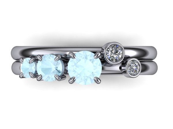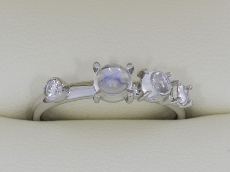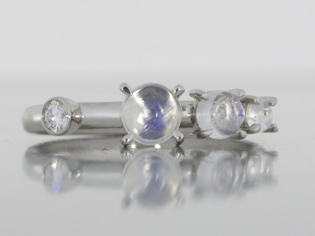 This platinum ring set fit together so well with the stones set above the bands to allow for the two to sit flush next to each other. The bands feature two diamonds bezel set on opposite rings with three luminescent moonstones clawset tapering in size sat along the band.