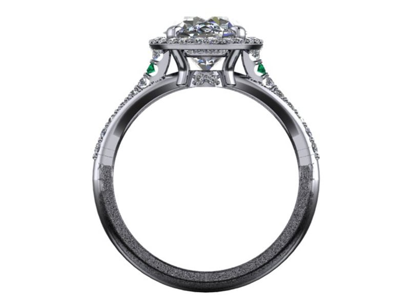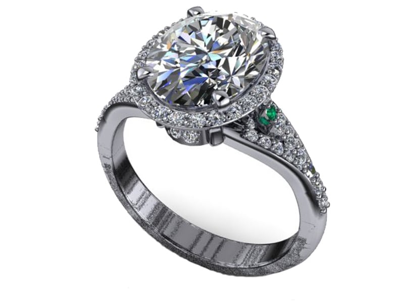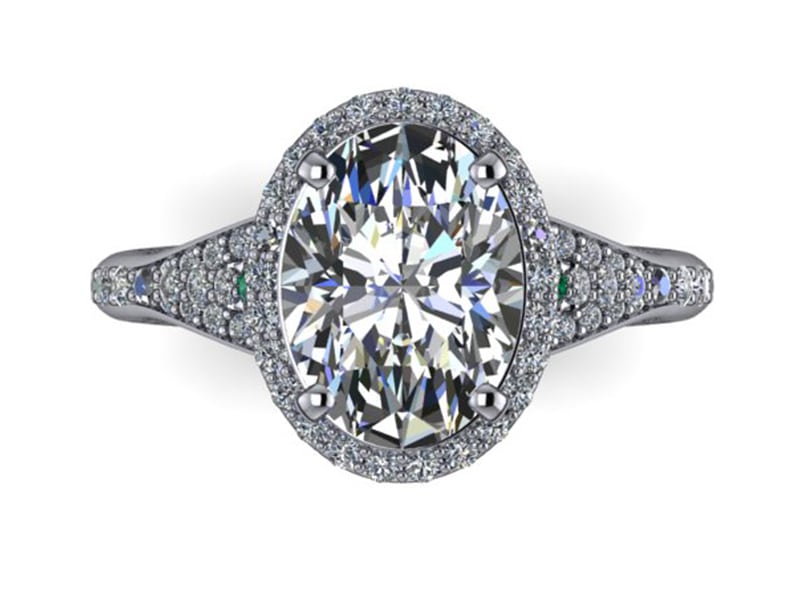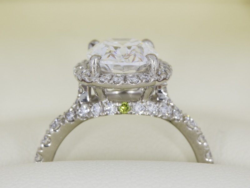 A completely one of a kind platinum engagement ring featuring a large 2.5ct oval diamond set with a diamond halo. This design has an interesting and thought provoking mix of a cathedral and split shank. The two separate arms of the split shank twist around the base of the stone to meet the other side. The ring also has a single green diamond adding a touch of sentiment and personality.