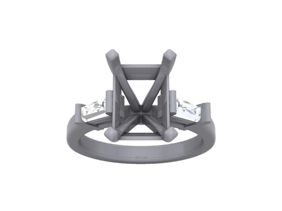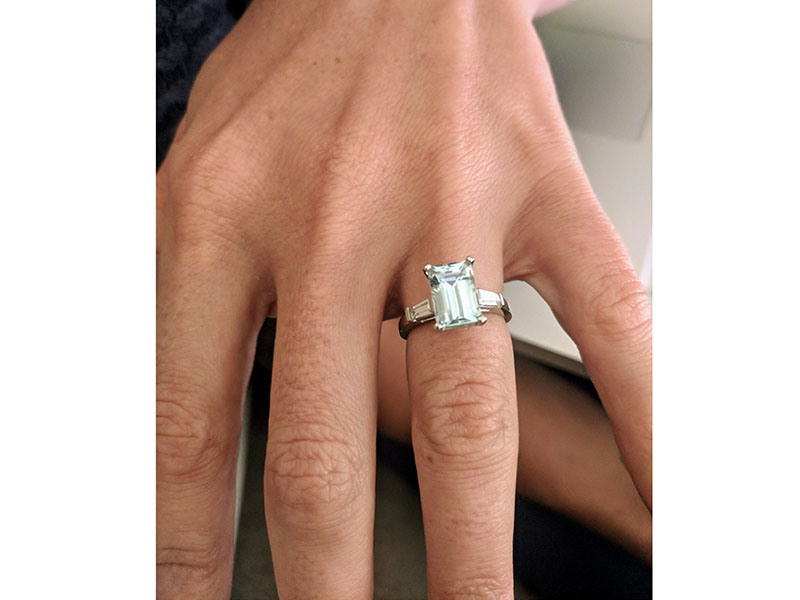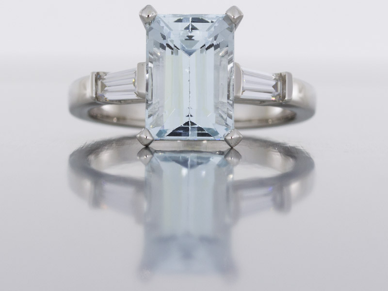 Art Deco style ring set with a jaw dropping emerald cut aquamarine with two tapered baguette stones on either side creating a modern trilogy.