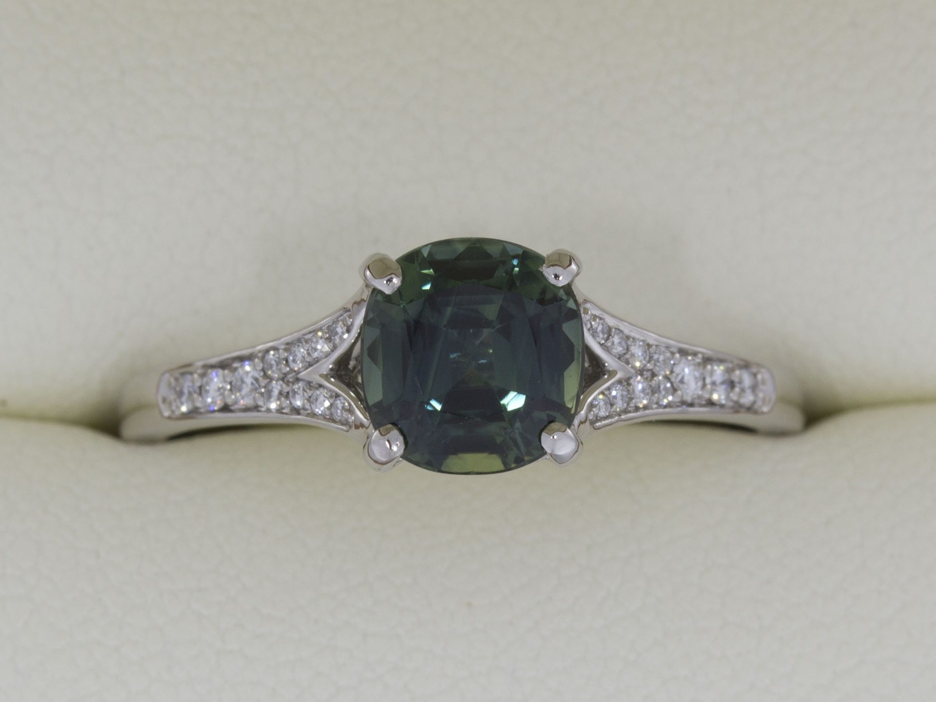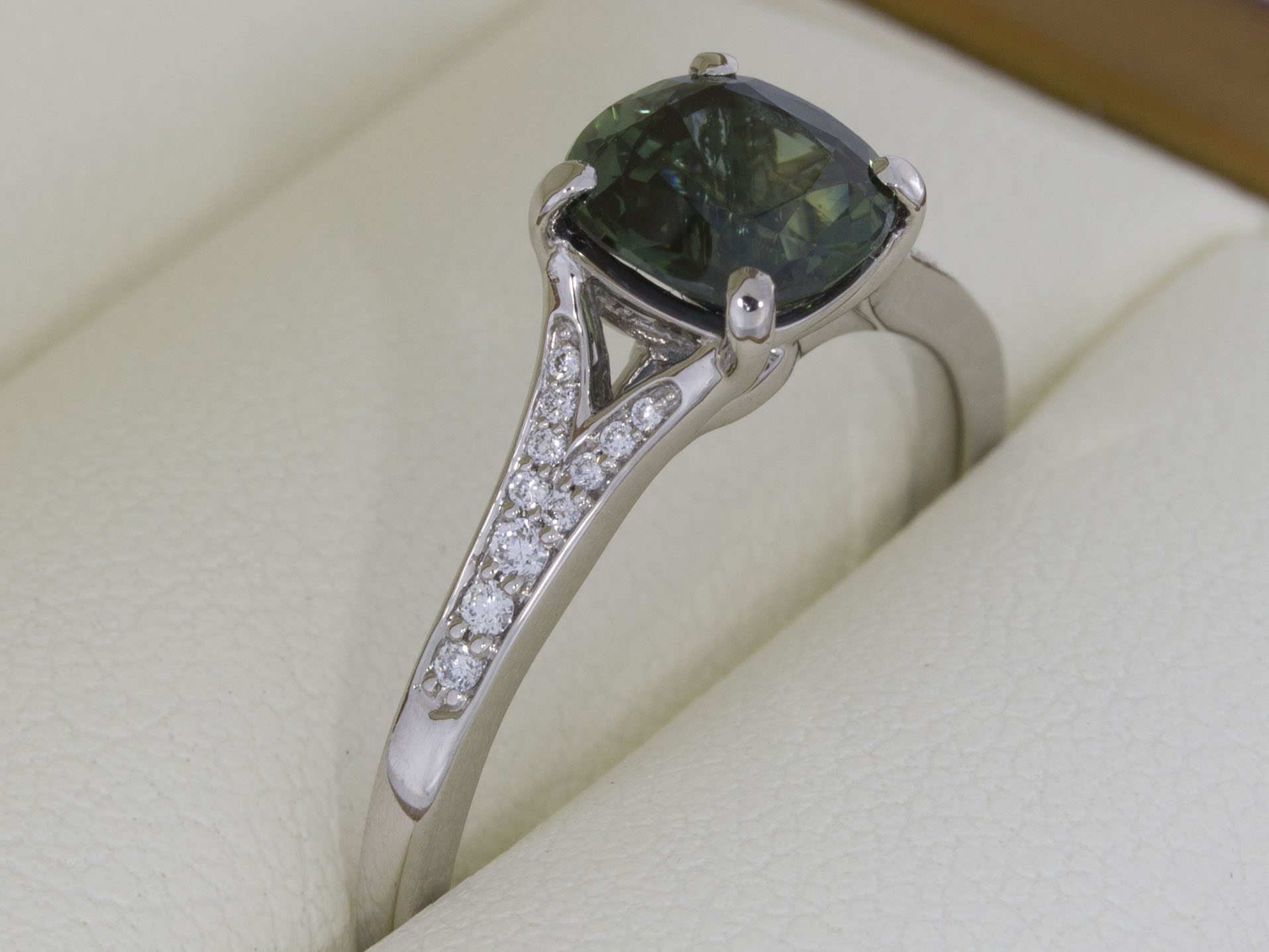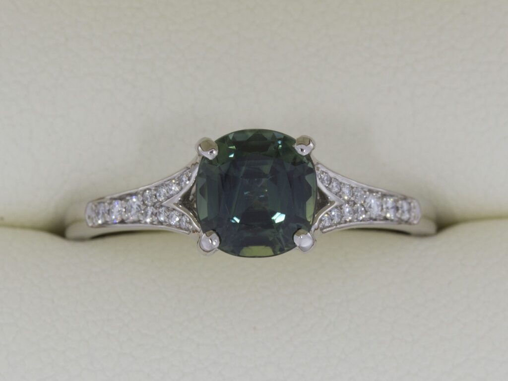 A Distinct Australian parti colour cushion cut sapphire, claw set in a beautiful split shank design. The arms of the shoulders are finished with grain set diamond shoulders.