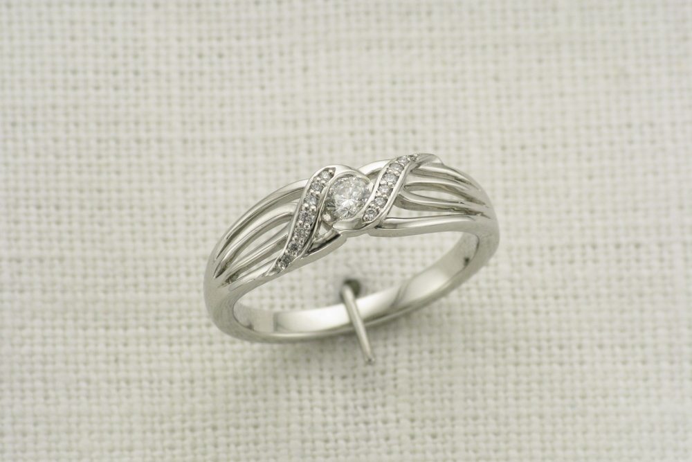 This weeks 'Ring of the Week' was brought to us by our client who had a very keen idea of the unique palladium engagement ring he wanted to create for his partner. The ring needed to be delicate and unassuming but richly adorned with some of their personal symbolism. In this client's case, it was the incorporation of a dragonfly. Underneath the bezel set, round cut, centre diamond, sits a dainty dragonfly that will sit on the finger as a secret to both the giver and the wearer. In addition to this symbolic feature, the shape of the dragonfly wings were incorporated into the design on the inner shank arms. These gracefully reach up and to brush against the ribbon of diamonds surrounding the centre stone. In addition to the symbolism embedded within this ring, was the desire for it to be very subtle. One of the best ways to achieve subtlety is to use smaller accent diamonds. This allows for the addition of texture as opposed to more sparkle, which is exactly what this client wanted. We used 1mm - 0.8mm accent diamonds within the ribbon to create this 'encrusted texture'. The ring was finely designed, with that unique symbolic personal touch that our client wanted.