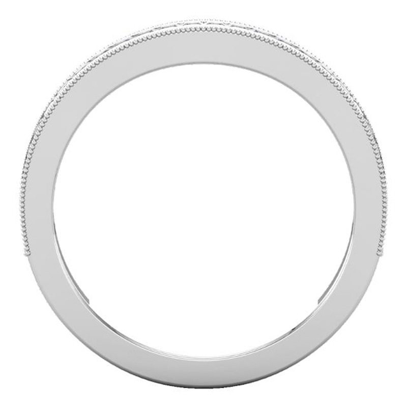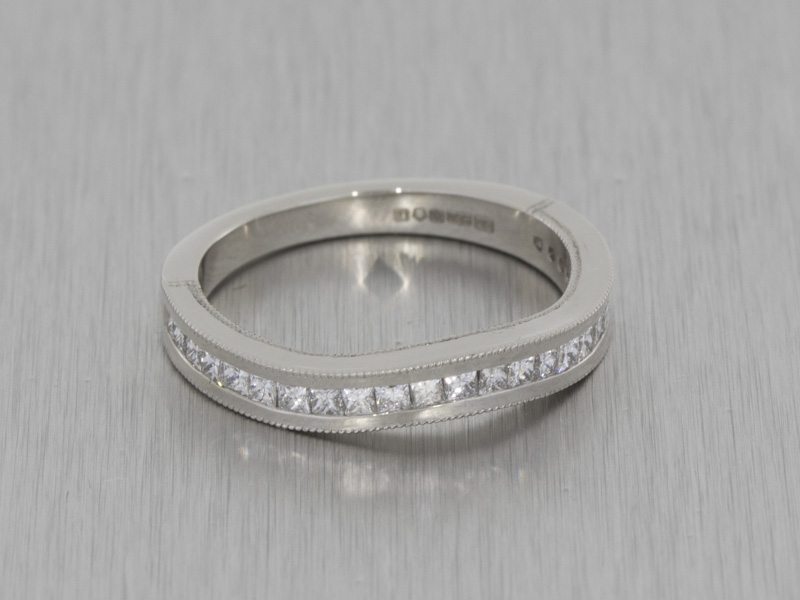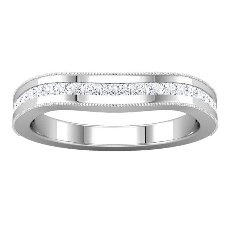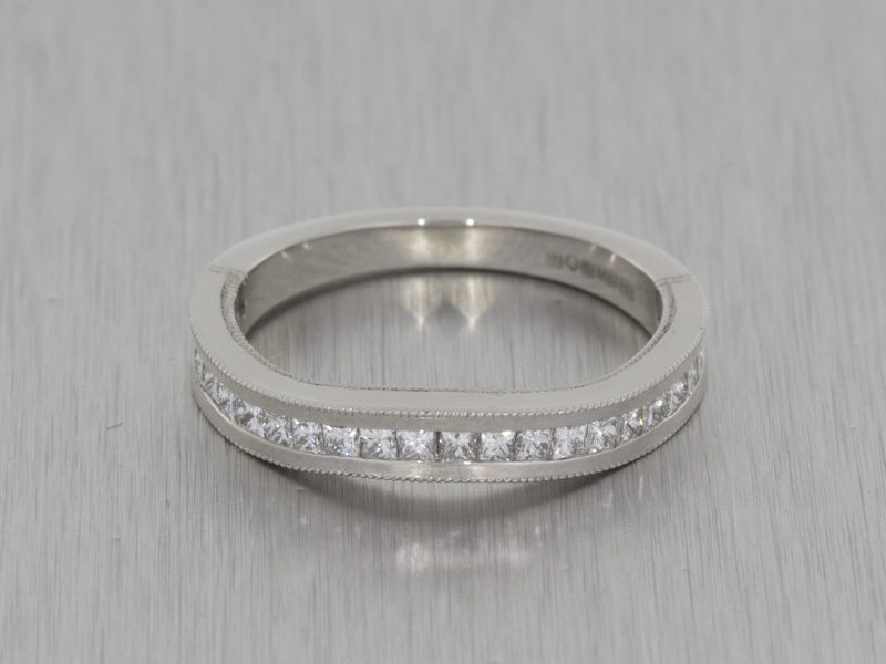 A fitted contemporary wedding band with a vintage flair given by millgrain detailing. This wedding band has been channel set with princess cut diamonds to complement an engagement ring we created.