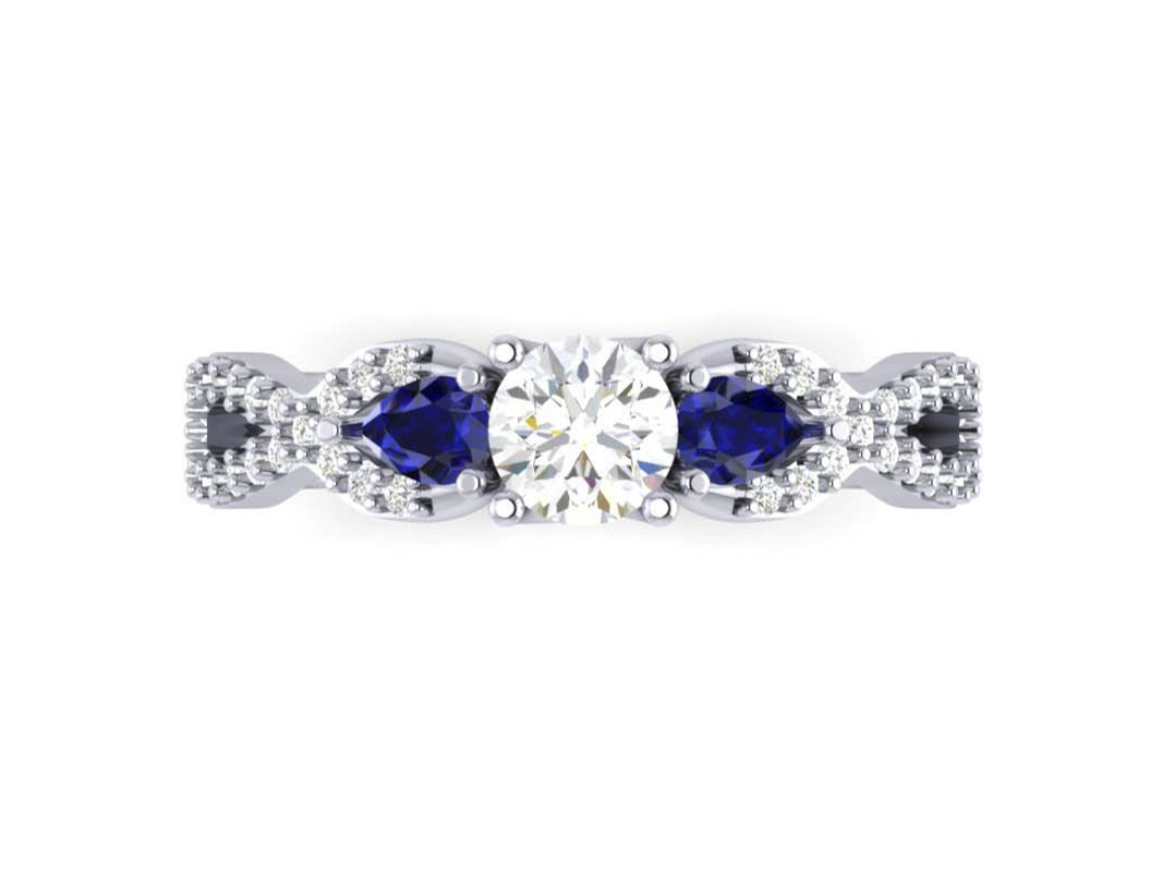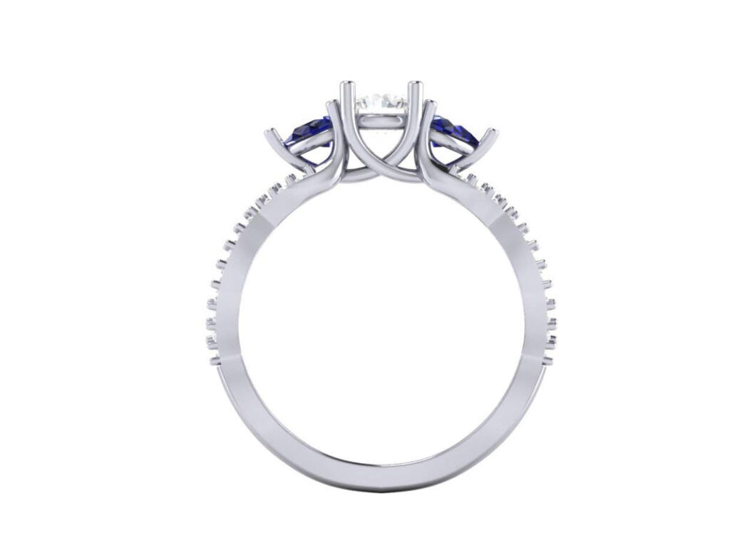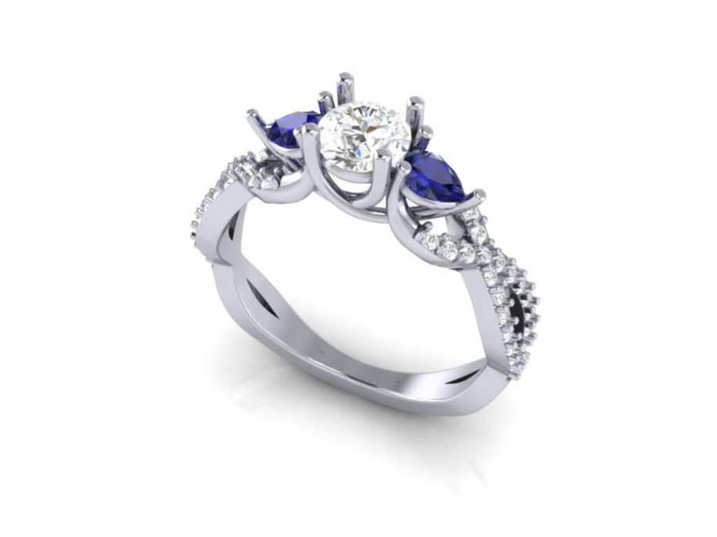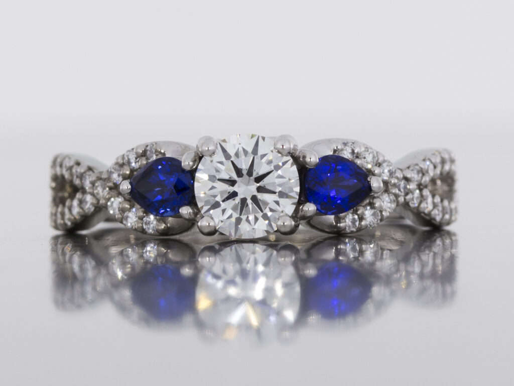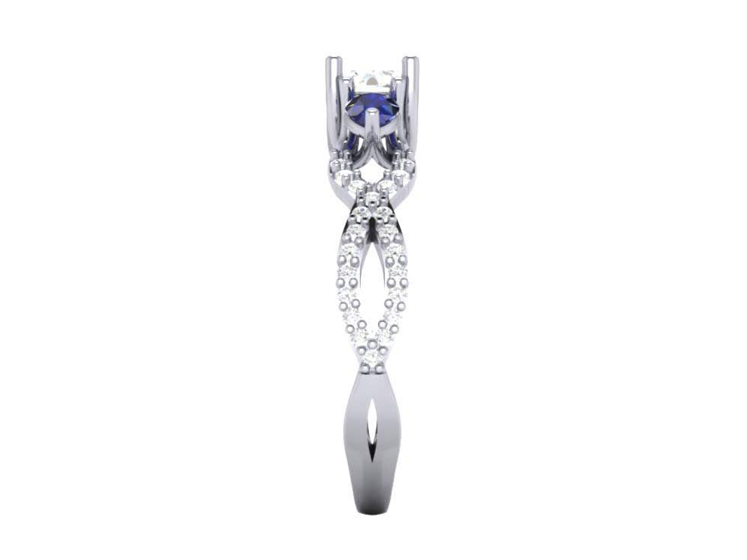 Crossover style palladium engagement ring set with diamonds and sapphires