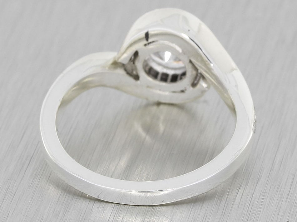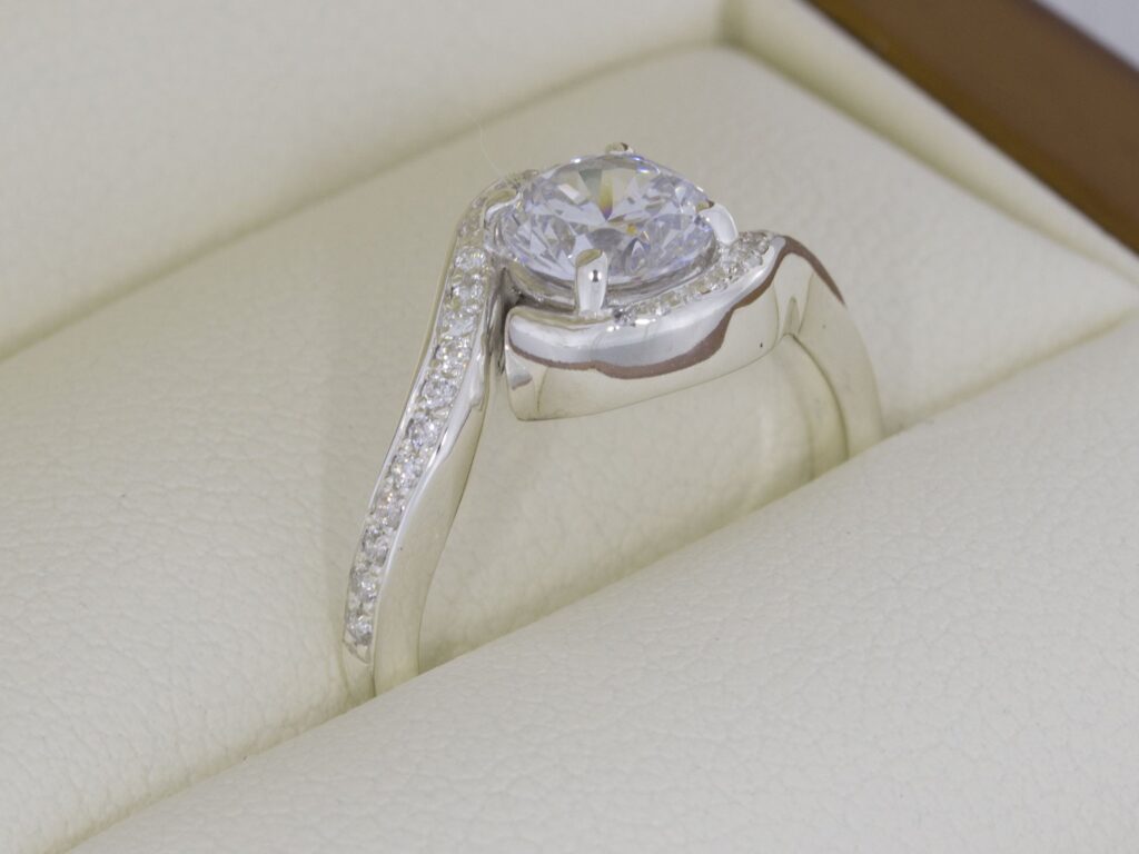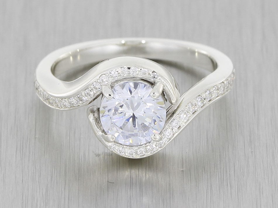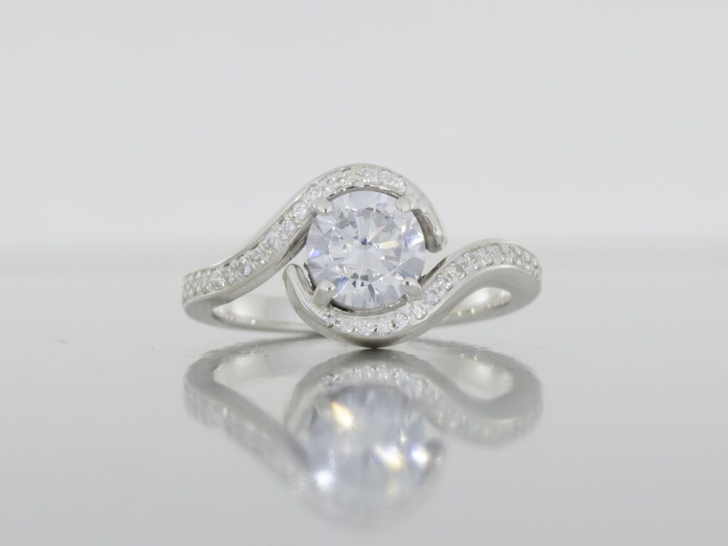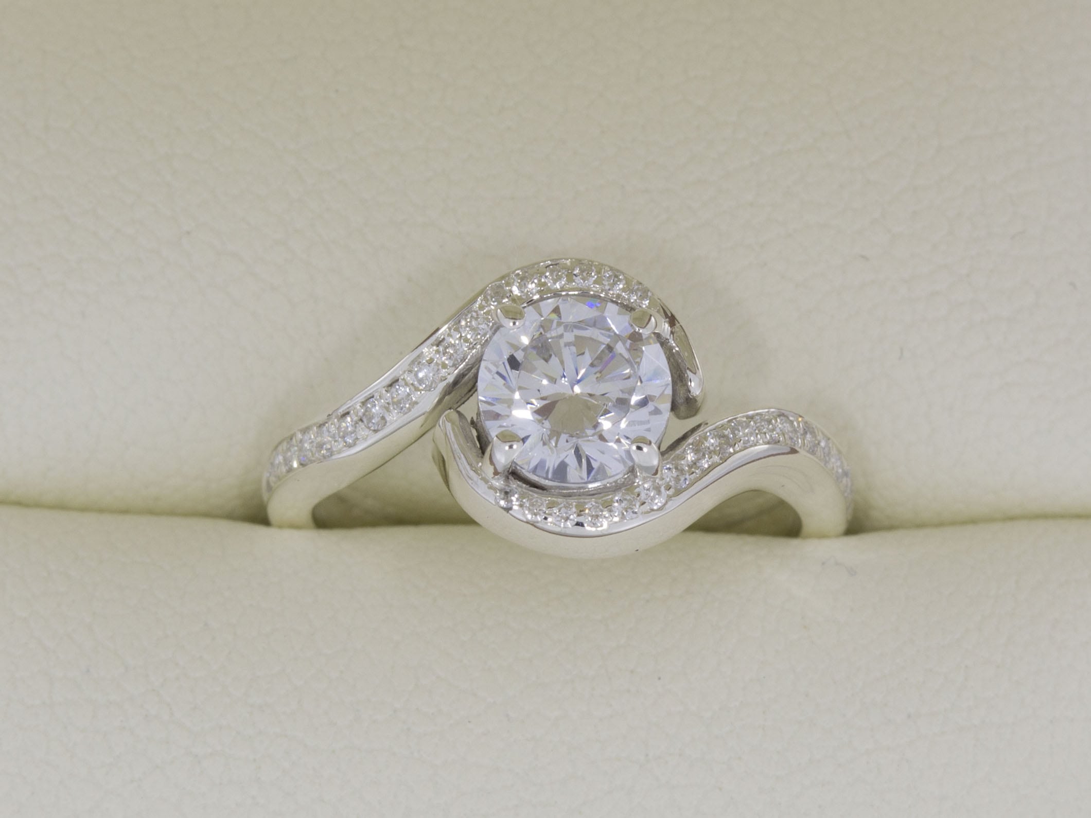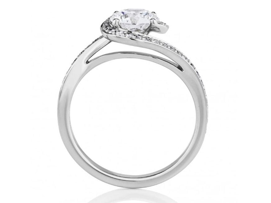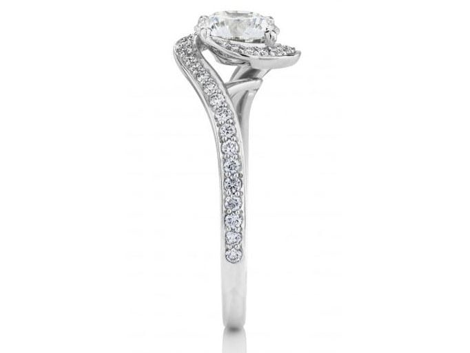 An enchanting diamond bypass style engagement ring with tapered arms creating an elegant halo for the central diamond. The two arms of the shank have been raised to allow a wedding band to sit flush underneath.