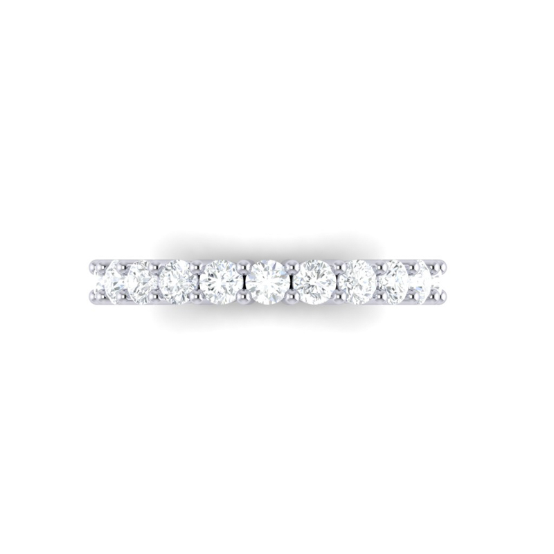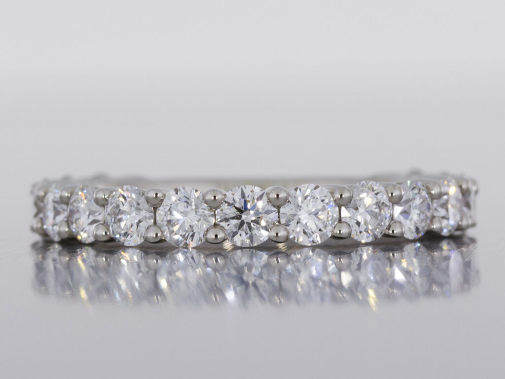 A bold round diamond shared claw Platinum eternity ring set with round diamonds of the highest quality