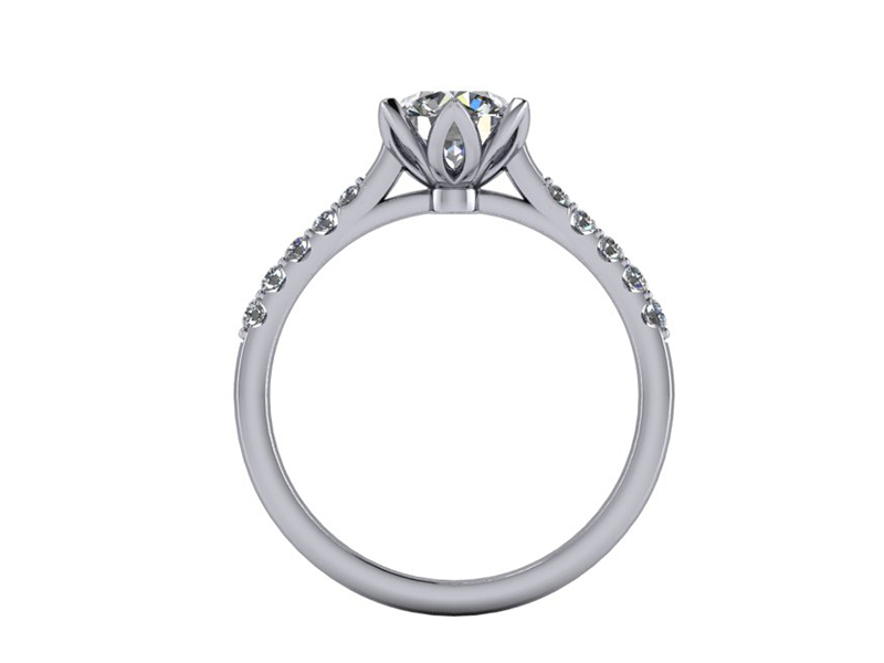 Our client was hoping to create something which was floral-inspired without being ornate. To achieve this, we created a petal outline that was arrayed around the centre stone to secure this beautiful 1ct diamond. In turn, this beautiful pattern created these beautifully shaped claws. The stones in the shoulder have been pave set to retain a delicate feel and enhance the diamonds for their optical performance