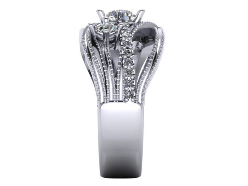This beautiful diamond wrap ring features a slightly modified take on milgrain, adding a vintage flavour to the overall look of this unique engagement ring. Three round brilliant diamonds were selected with a single row of grain set accent diamonds with the remaining wrap bands channeled with the modified milgrain pattern to create this comfortable and textural bespoke ring design.