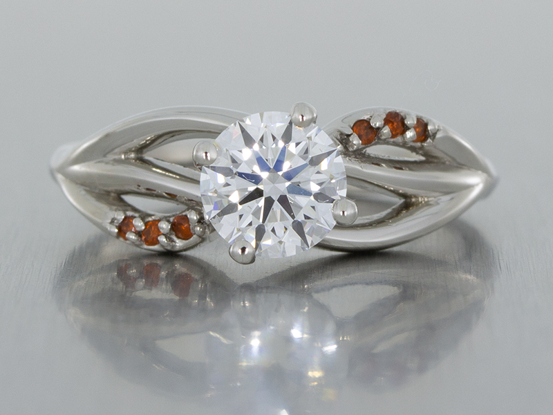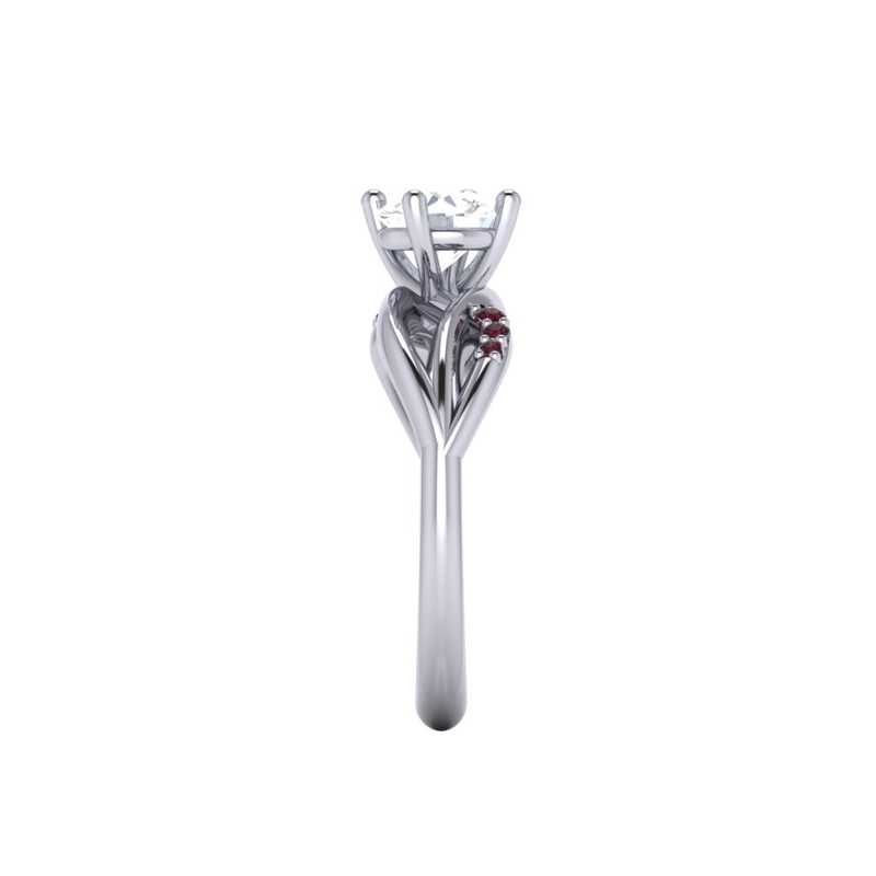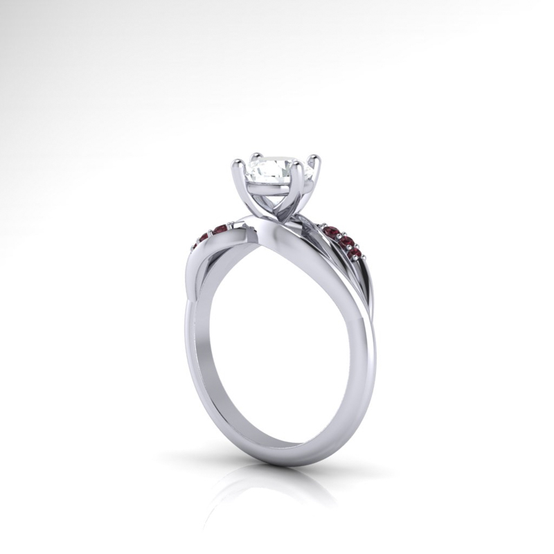 Organic platinum engagement ring set with a Brilliant cut Diamond and red garnets