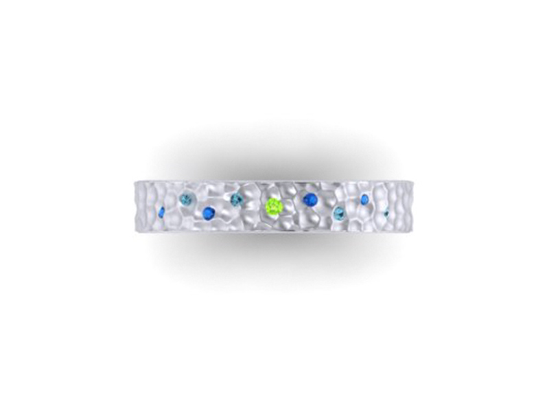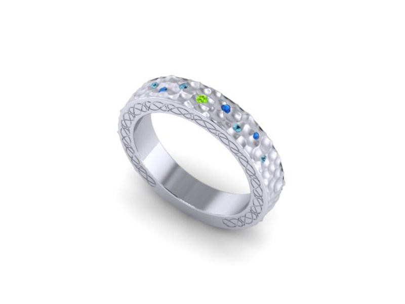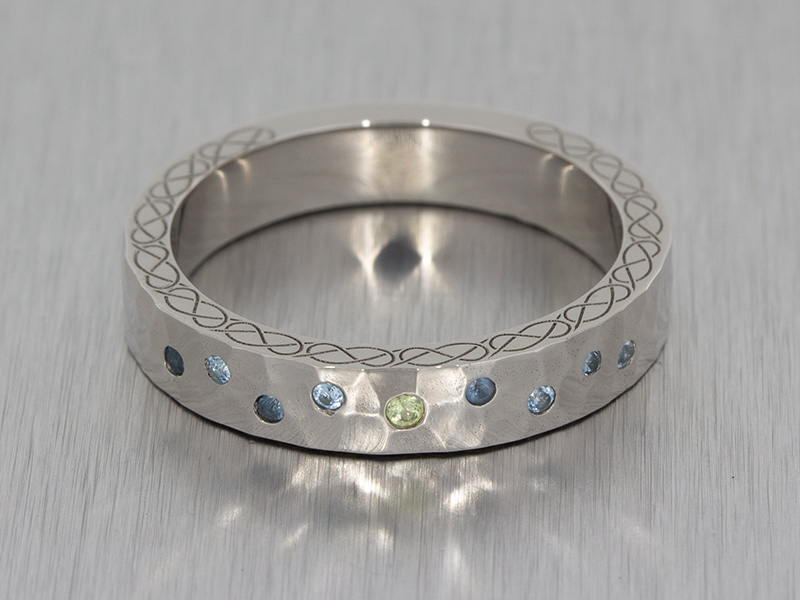 A wide hammered textured palladium band set wonderfully with striking aquamarine and peridot stones finished with unique celtic engraving on the faces