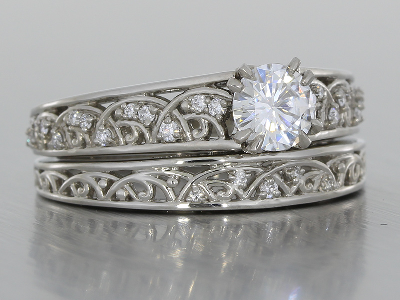 This wedding ring set was created to have matching scrollwork and diamond placement. The engagement ring was set with a brilliant cut moissanite which looked stunning nestled in double claws and against the palladium and diamond detail of the two bands.