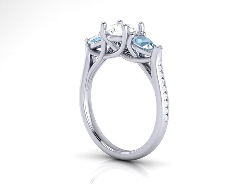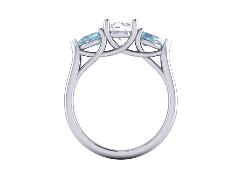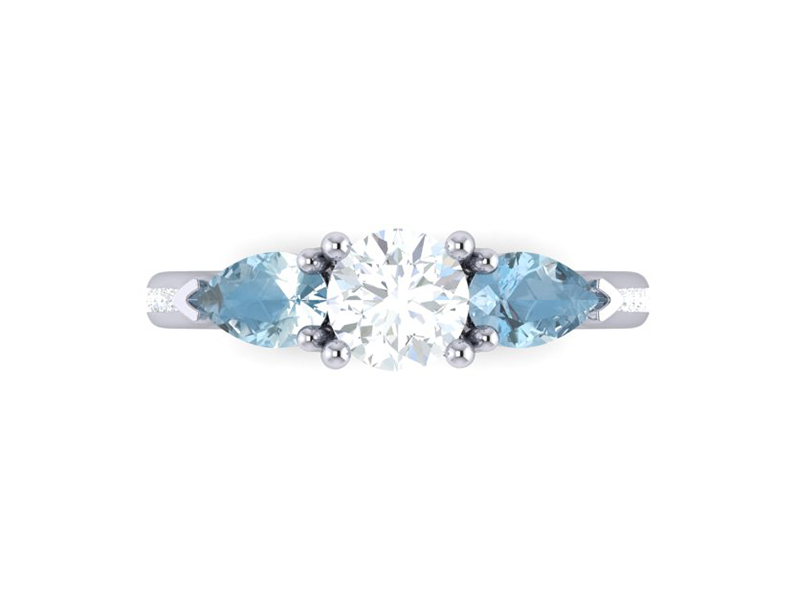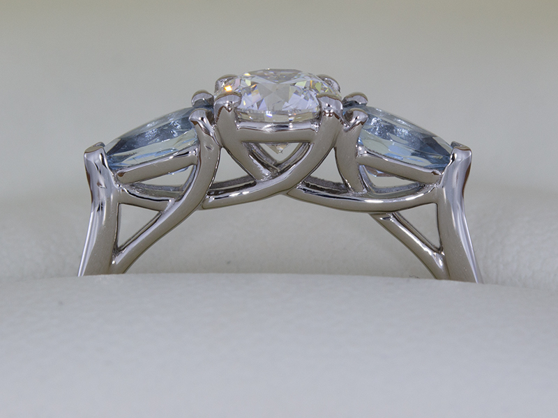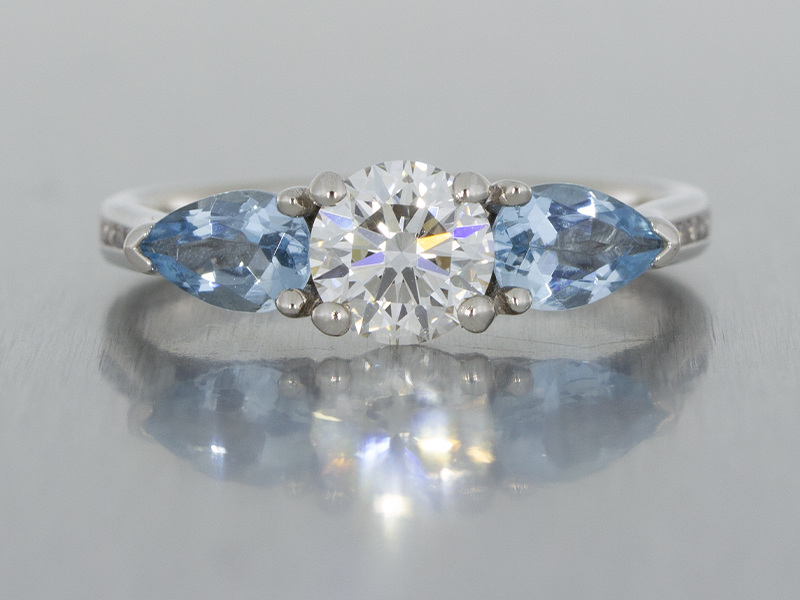 Palladium three stone, round diamond and pear shape aquamarine ring