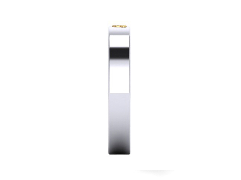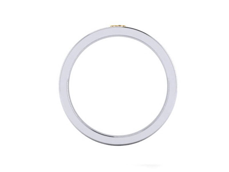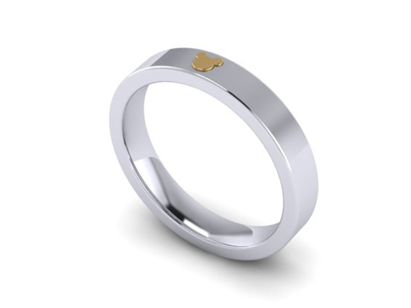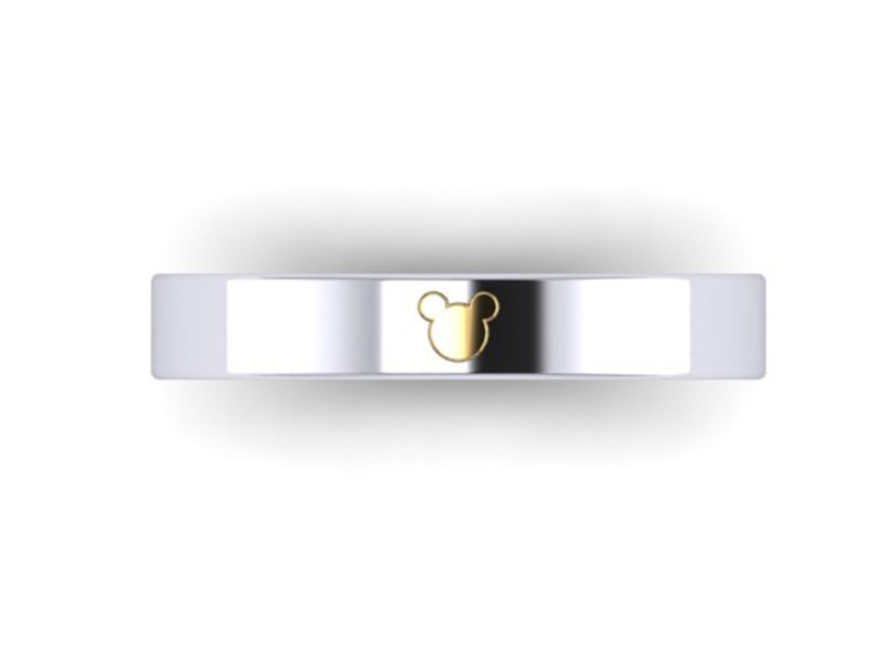 This contemporary gents engagement ring is made in a polished platinum metal with a soft square profiling. The ring is completed with a yellow gold Mickey mouse adding a unique personal touch