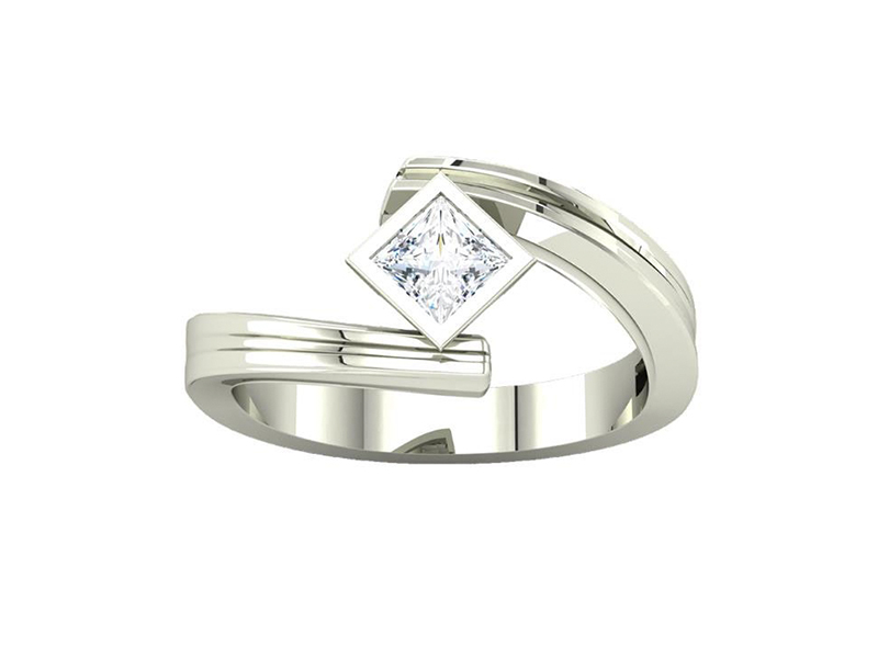 The design of this ring breaks the boundaries of what a Gents engagement ring should be. This contemporary and beauteous ring features a fiery princess cut diamond housed in a grooved bypass shank. The ring has been complimented by a polished finish.