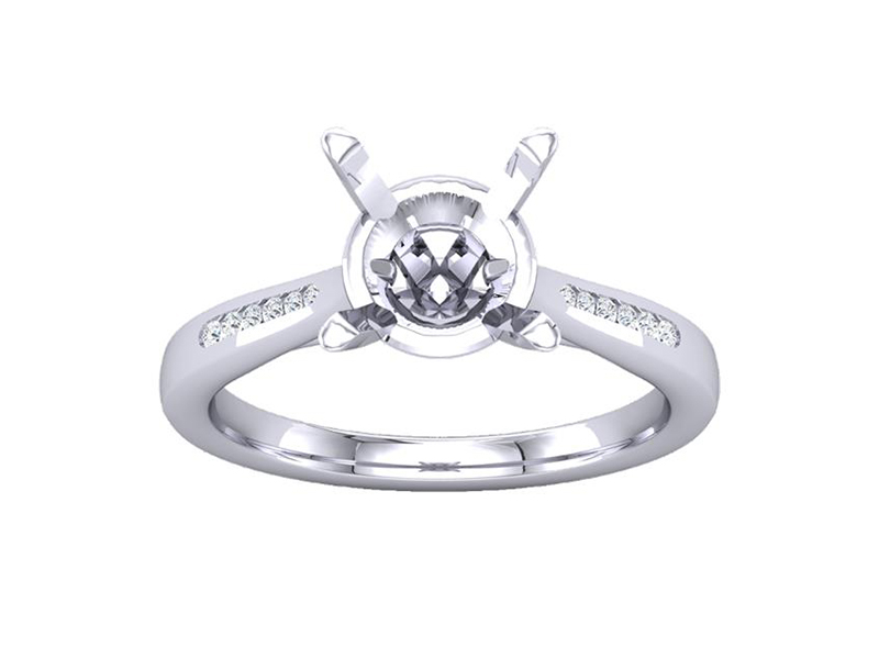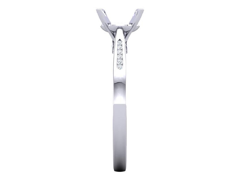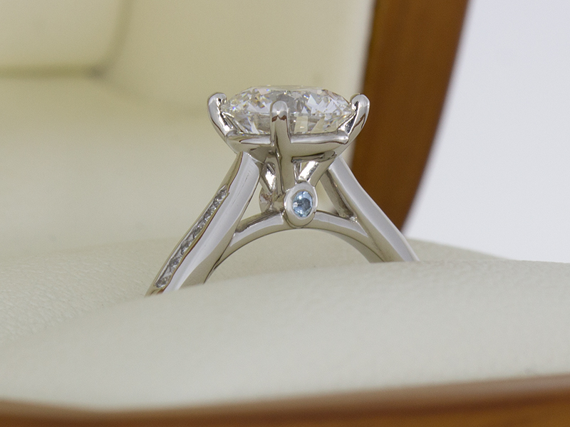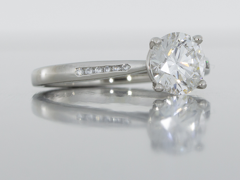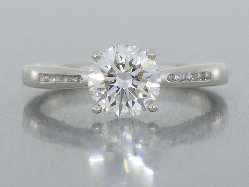 Platinum solitaire engagement ring set with a round brilliant diamond and channel set shoulders