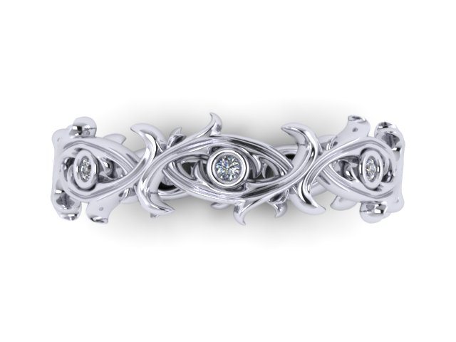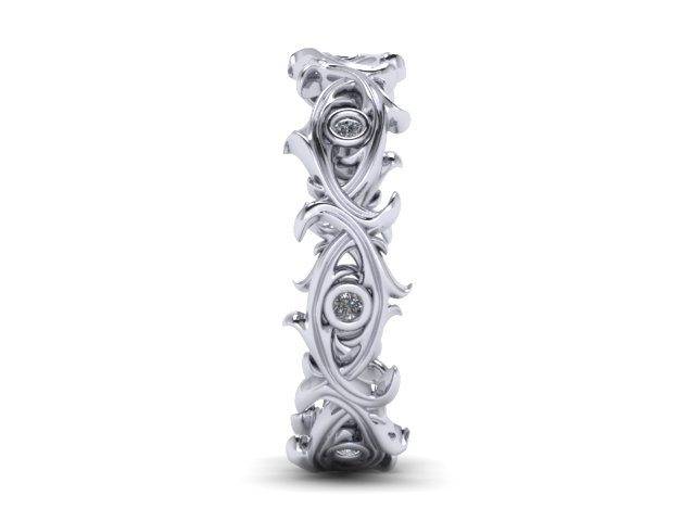 This Diamond set wedding band was designed with a renaissance and floral hint concept. Set with a scattering of bezel set diamonds this sculpted band has been carefully designed to be worn as a single ring. The wedding band compromises an intricate pattern which draws from renaissance patterns and designs, acanthus sconce's and Venetian history with a sprinkling of bezel set diamonds. The design warranted an 'old world' hand forged feel.