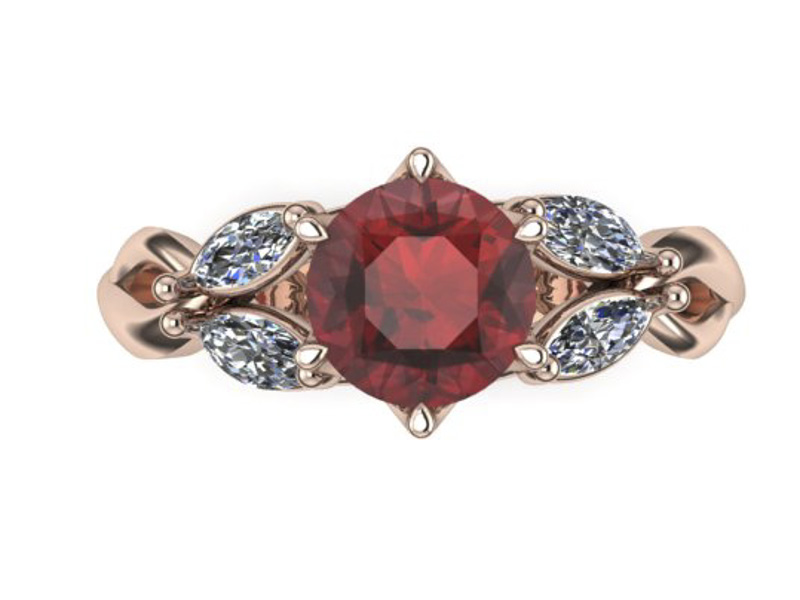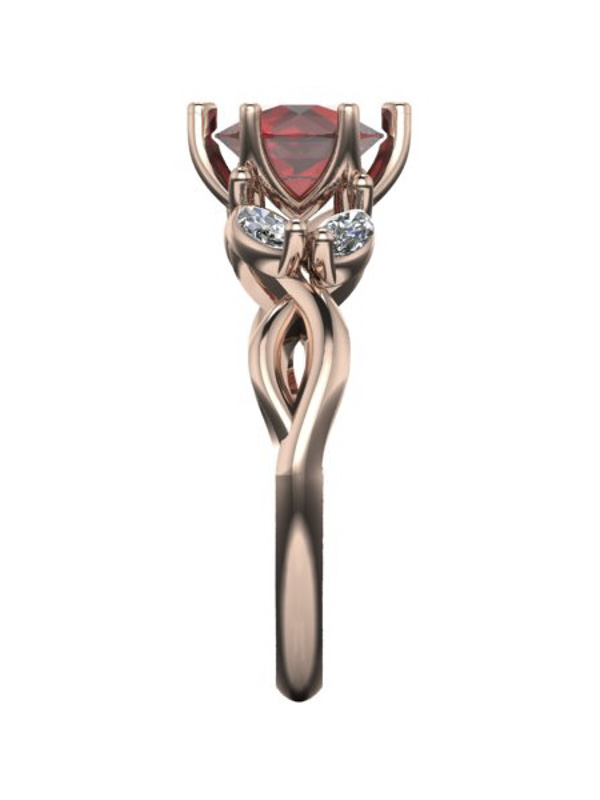 An organic and alluring 18k rose gold engagement ring with an entwined band that flows up to create the setting for the centre hearts and arrows moissanite. The bands are studded with marquise shaped garnets adding a touch of colour and personality to the ring.