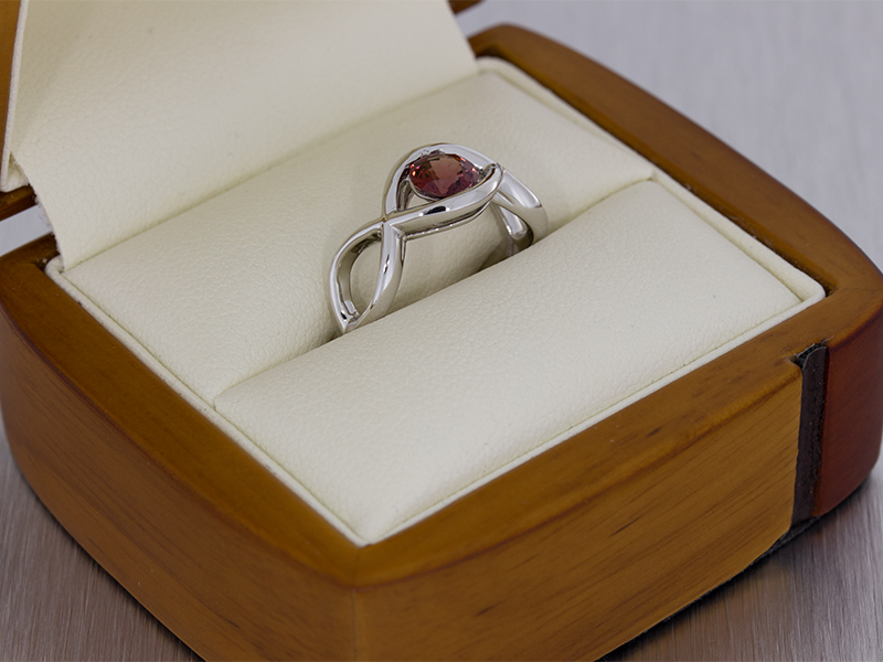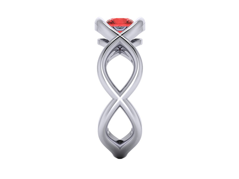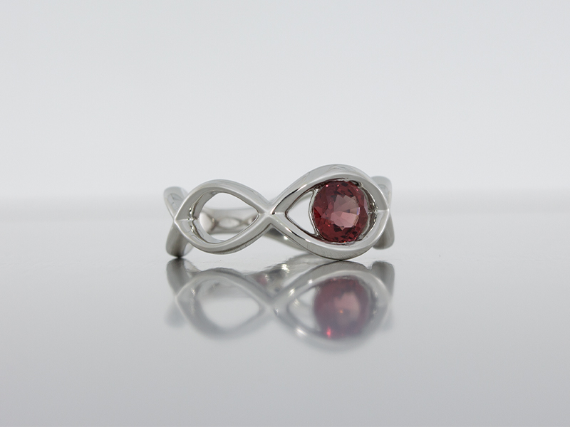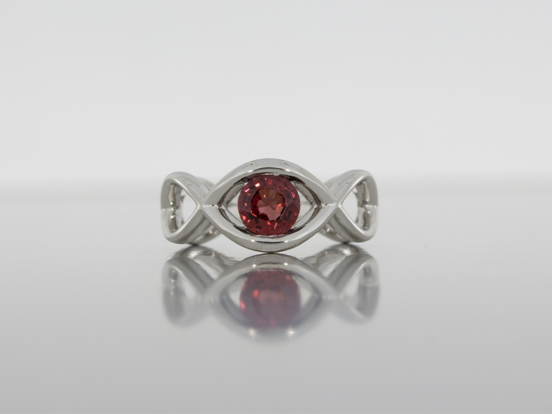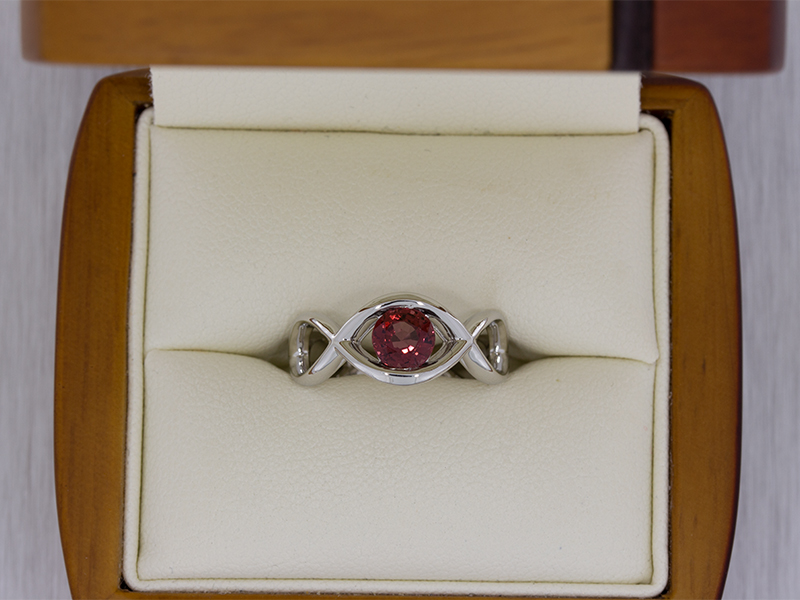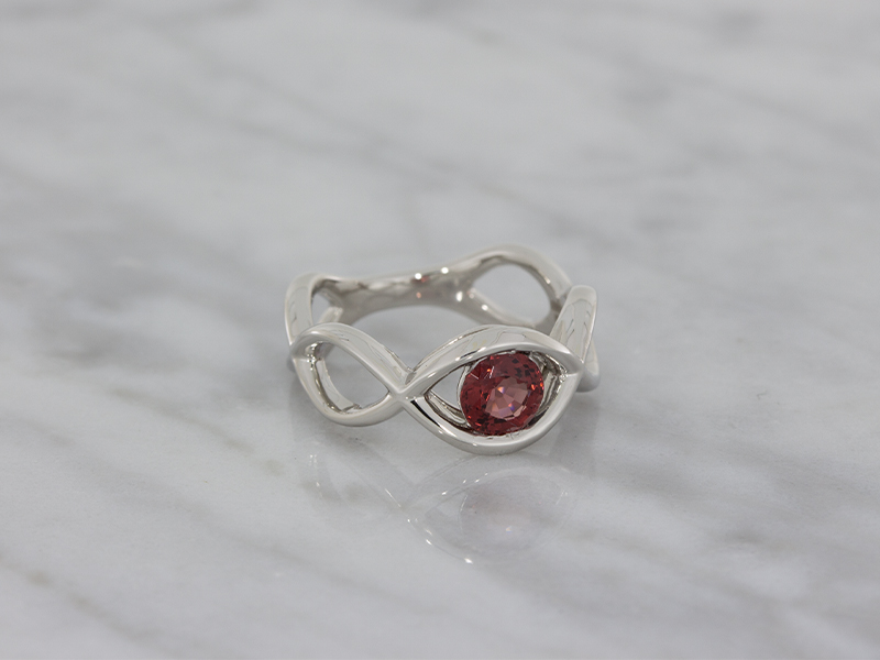 In this design, the client has chosen a beautiful round dark reddish Spinel gemstone to be set semi flush in a platinum mount. The band has a woven effect that creates an overall organic and fluid feel to the ring.