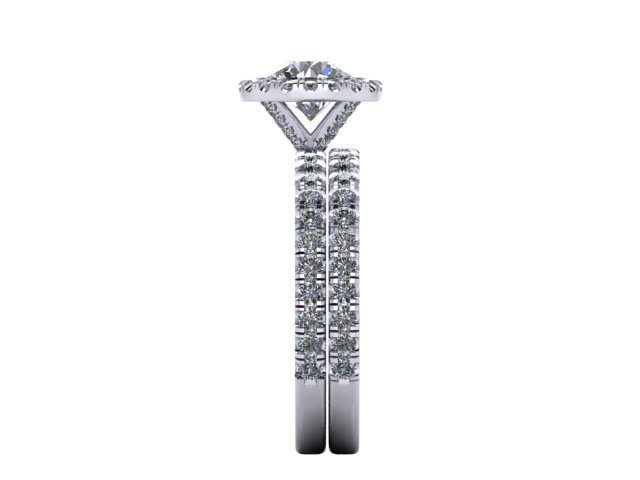 This stunning Platinum and Diamond ring set was created to our client's design briefing after they had seen a centre stone that appeared to be 'floating' in the middle of a diamond aura halo. We decided to use a scallop setting, which gives a minimal metallic appearance and allows for the diamonds to take focal centre stage. We modified the accent halo and large centre diamond so that the same micro prong settings for the halo diamonds inner settings could also grip the centre stone.  Additional accent diamonds were set into the arms supporting the halo to create further focus. This made a stunning engagement ring and an even more beautiful Bridal ring set, with the addition of a perfectly matched wedding band.