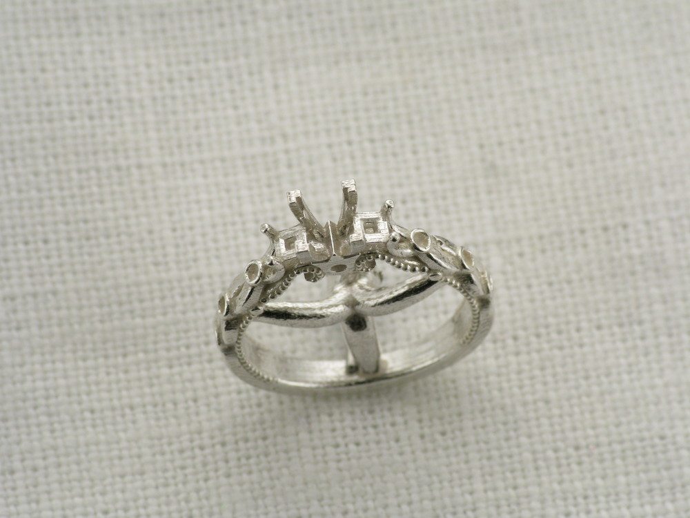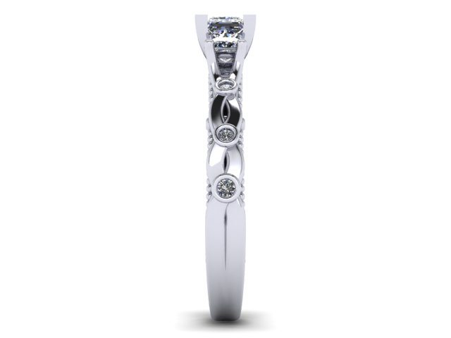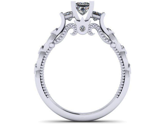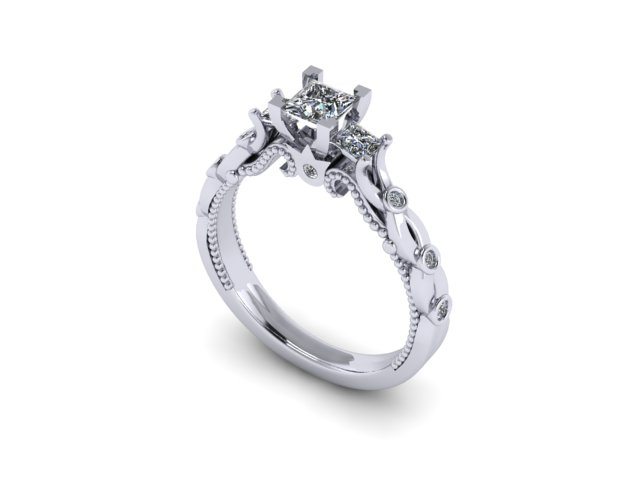 This beautiful proposal ring was inspired by the gorgeous 'Verragio' rings. There are numerous variations of this design in existence, and our client wanted to create something truly individual and unique without loosing the impact of the incredible designed features. The band in itself is not just an extension of the diamonds, but also an integral prominent feature. In the centre we decided to leave the plated arms plain which enables you to see each detail clearly. We incorporated accent diamonds into the plated section using the bezel setting, allowing these to become additional design features. The three diamonds in the centre were raised to emphasise the ring's dramatic atmosphere. The swirls are set apart perfectly by the milgrain adding more detail to the piece. The centre princess cut diamond features four corner claws to emphasise the shape, whereas the two side stones are softer and incorporated into the band.