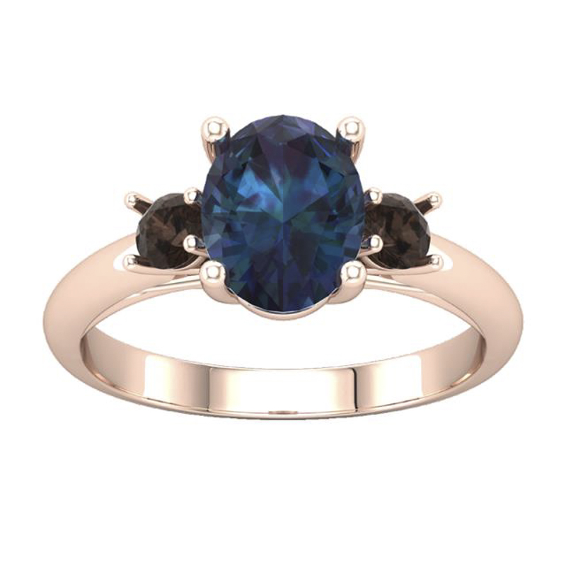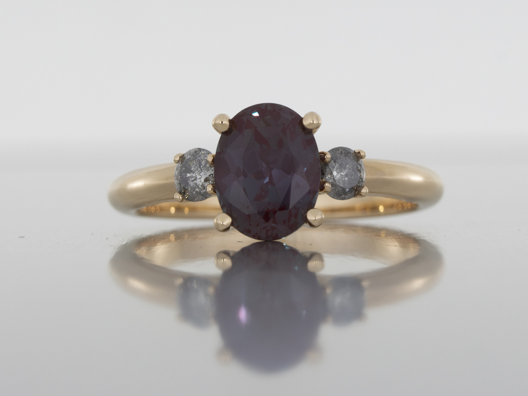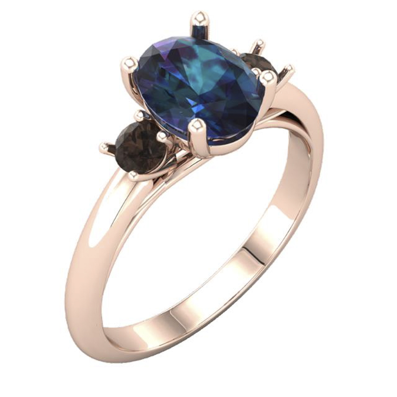 Trilogy ring crafted in 18k rose gold set with an oval Alexandrite with two smaller round salt & pepper diamonds on either side