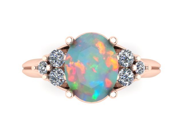 Our client, for this week's 'Ring of the Week' project, had a passion for statement pieces and vintage inspired jewellery. With that as our premise for the design brief, we explored a variety of options before collectively deciding on using a stunning Australian Opal centre stone. The Australian Opal has a beautiful creamy colour with multi-tonal shades of peach and green. The double trio of diamonds, presented at each side of the centre stone, compliment and emphasise its dramatic presence. These design details allow for the vintage, romantic and glamorous inspiration to come to fruition in this piece. The Rose Gold brings additional warmth and balance to the ring. The end result was delightful and captured our clients personality perfectly. This was a truly joyful project to work on.