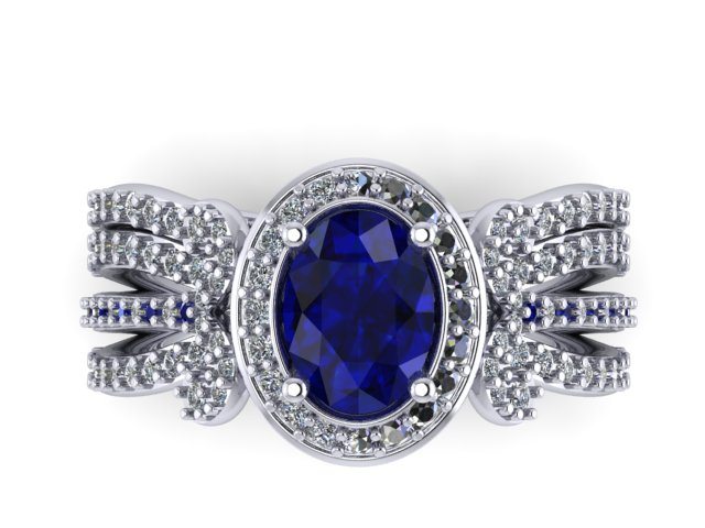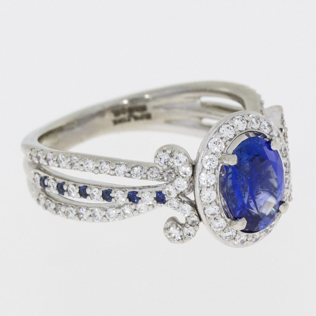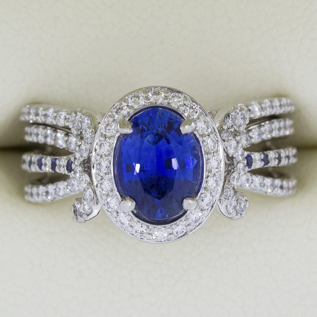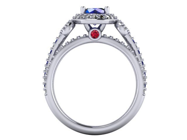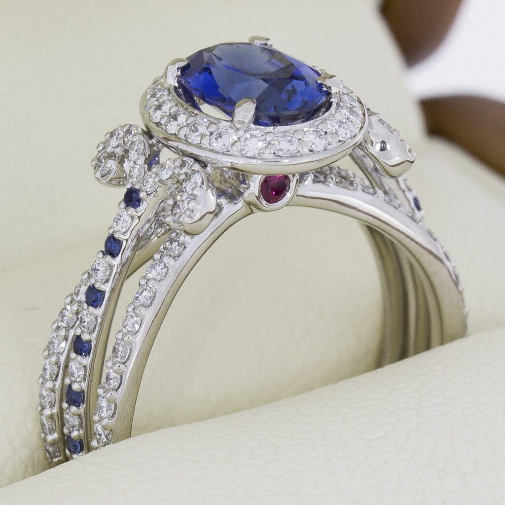 This beautiful, regal ‘Ring of the Week’ was created for our client who requested a vintage inspired yet modern sapphire and diamond engagement ring. The organic, free flowing split shank houses a multitude of round cut white diamonds that gracefully flow toward the blue sapphire centre stone, encased in a halo of further diamonds. The sapphire and diamond accent stones cascade upward through the organic middle band to greet the centre stone. A single red ruby is hidden in the bridge accent of the ring, accentuating the intricate enchanting detail and personal meaning of this piece.