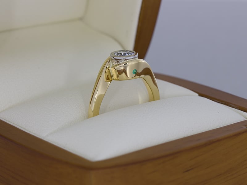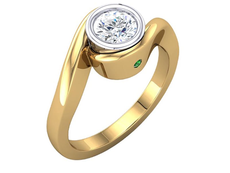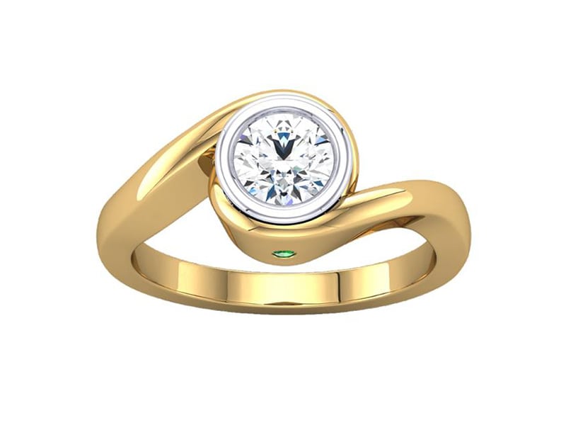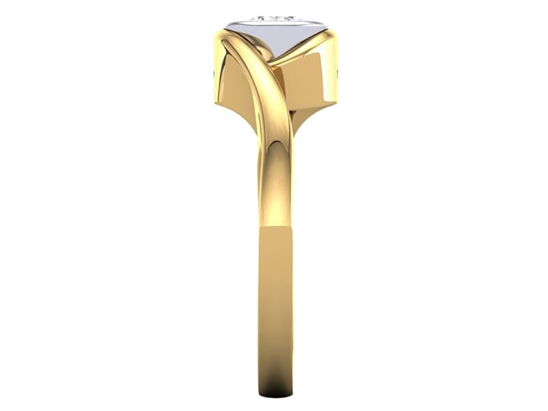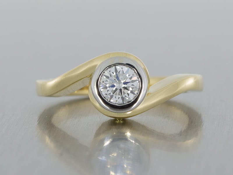 This design is sophisticated and elegant. The yellow gold shank frames the round brilliant beautifully whilst the diamond is secured in a platinum bezel setting.