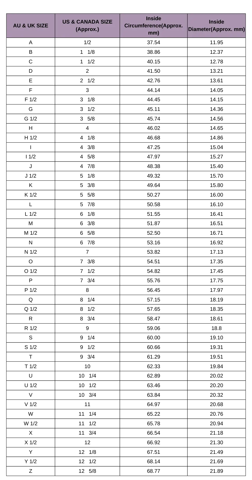 This size chart will help you understand ring sizes in both UK and US standards, including their diameters. It will guide you through conversions to find the ideal size for your bespoke jewellery.